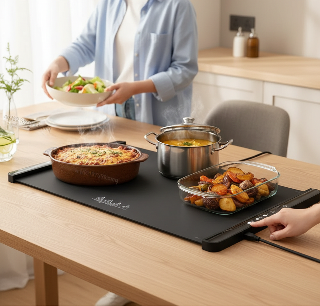 The generously sized surface accommodates multiple dishes at once, making it ideal for family meals, buffets, and entertaining guests at home.